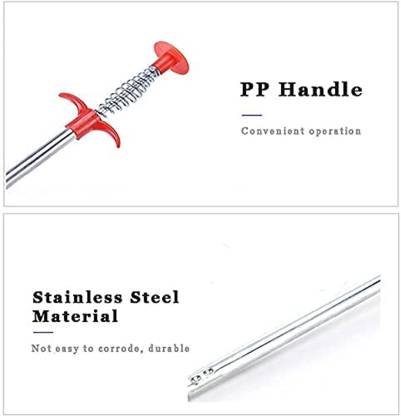 WeCareSmart drain cleaning tool is long extendable & retractable narrow telescopic grabber arm rod, hair catcher, and trash picker for long range bended pick-ups into the hardest corners, areas, angels & channels, with maximum mechanical control. SPECS: 3” Red Grip - 2-1/2” Handle Spring - 32 inch Spring Loaded Cable – Shaft is approximately 0.75 Diameters at widest point - Claws/Prongs extends out 1-1/8” and spreads 1 inch – Lifts materials up to 1 Ib. DESIGN: Flexible & bendable wound-steel spring loaded cable with easy comfortable grip handle on top, with heavy duty steel spring and retractable claws on the bottom, makes this grabber tool accessible to all hard to reach narrow bended places and makes easy retrieval of small and non-ferrous objects that magnets cannot. QUALITY: Hard non-breakable Red Plastic handle, with Super Sturdy Steel Spring which doesn’t get rusty or stuck when pressing down, and Long Range Flexible Wound-Steel Constructed Cable, & Carbon steel claw for insured pick up - rust resistance for a long lasting life – Not Magnetic. USE FOR: Ideal for kitchen, bathroom, toilet, utility sinks, bathtubs and shower Drain Cleaning - Handy Tool to grab any item, trash, or lost object under Stove, Freezer/Frigidaire, car, appliances, furniture or any other place which is hard to get access to like a Dryer Vent – the Perfect Plumbing Tool to resolve Slow or Clogged Drains.